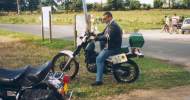 Après quelques mails et un coup de fil, rendez-vous est fixé avec Jésus/Bertrand au rond point du centre commercial Continent/Cote de Nacre. Dans le genre romantique pour une premiere rencontre, j'ai connu des endroits plus subtils. Celui-ci avait au moins l'avantage d'être facile à trouver. Quelques minutes de retard pour moi, les NetVikings sont à l'heure, chose rare chez eux, parait-il ! (La présence d'un Parisien les aurait-il impressionné ?)Le temps de faire le plein pour moi, on tape un peu la discute, en se présentant : Bertrand, dit Jésus, roule sur un DR600 Suzuki millésime 87. Bonne année, mais sur le déclin ;-) a consommer rapidement avant qu'il ne s'évente ;-)) La déco maison (taupe caisse peint à la main couleur vert sapin) et réservoir à la peinture de salle de bain, avec quelques décalcomanies, selle en lino de récupération forcent l'admiration et laisse entendre que Jésus trouve ses pièces et ses accessoires soit chez Bricomarché, soit chez Emmaüs ;-) Une somme de bricolages (j'allais oublier le cache-misère qui planque les multiples trous du pot d'échappement) qui sont autant d'hommages à l'ingéniosité d'un homme qui roule sur une des motos les plus mythiques de l'Internet, depuis l'invention de FRM. [j'en dirais plus sur le sujet, un peu plus loin]