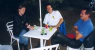 Vous devinez quoi ? Il tente (et réussit !) un Burn. [la photo est arrivée !] Un gros, en plus ! Il faut dire qu'il est aidé par Benjamin qui soulève la moto par le pare-jambe et par Julien qui attend vraiment que le pneu brûle pour appuyer sur le declencheur. Tout le monde disparait dans un nuage de fumée blanche (toxique, parait-il !). On espère que la photo est bonne, au moins ! Dire que le pneu était neuf, à peine rodé ! Consternant de bêtise, ce burn... Et pourtant, quand il s'agit de faire une première mondiale, on peut compter sur le Moto-Guzzi Wrecking Crew, qui dans des instants pareils, mérite bien son nom.