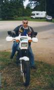 Après quelques mails et un coup de fil, rendez-vous est fixé avec Jésus/Bertrand au rond point du centre commercial Continent/Cote de Nacre. Dans le genre romantique pour une premiere rencontre, j'ai connu des endroits plus subtils. Celui-ci avait au moins l'avantage d'être facile à trouver. Quelques minutes de retard pour moi, les NetVikings sont à l'heure, chose rare chez eux, parait-il ! (La présence d'un Parisien les aurait-il impressionné ?)Le temps de faire le plein pour moi, on tape un peu la discute, en se présentant : Bertrand, dit Jésus, roule sur un DR600 Suzuki millésime 87. Bonne année, mais sur le déclin ;-) a consommer rapidement avant qu'il ne s'évente ;-)) La déco maison (taupe caisse peint à la main couleur vert sapin) et réservoir à la peinture de salle de bain, avec quelques décalcomanies, selle en lino de récupération forcent l'admiration et laisse entendre que Jésus trouve ses pièces et ses accessoires soit chez Bricomarché, soit chez Emmaüs ;-) Une somme de bricolages (j'allais oublier le cache-misère qui planque les multiples trous du pot d'échappement) qui sont autant d'hommages à l'ingéniosité d'un homme qui roule sur une des motos les plus mythiques de l'Internet, depuis l'invention de FRM. [j'en dirais plus sur le sujet, un peu plus loin]